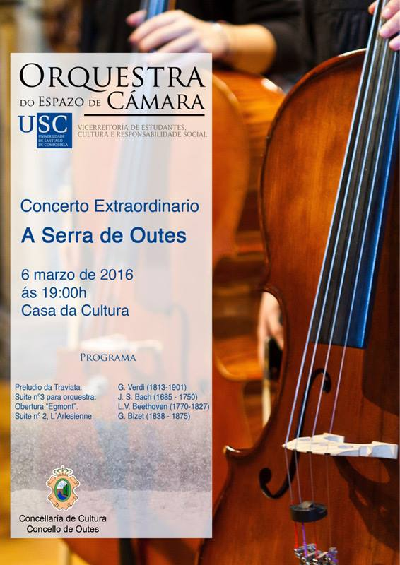 Para los amantes de la música clásica y para los que todavía no habéis descubierto lo “extraordinaria” que es, este domingo se celebra un concierto en la Casa da Cultura de Outes a cargo de la Orquestra do Espazo de Cámara da USC (Orquesta Universitaria). Una oportunidad para escuchar partituras de Verdi (Preludio de la Traviata), J. S. Bach (suite nº3 para orquesta), Beethoven (la obertura de “Egmont”) y Bizet (suite nº2 L’Arlesienne).