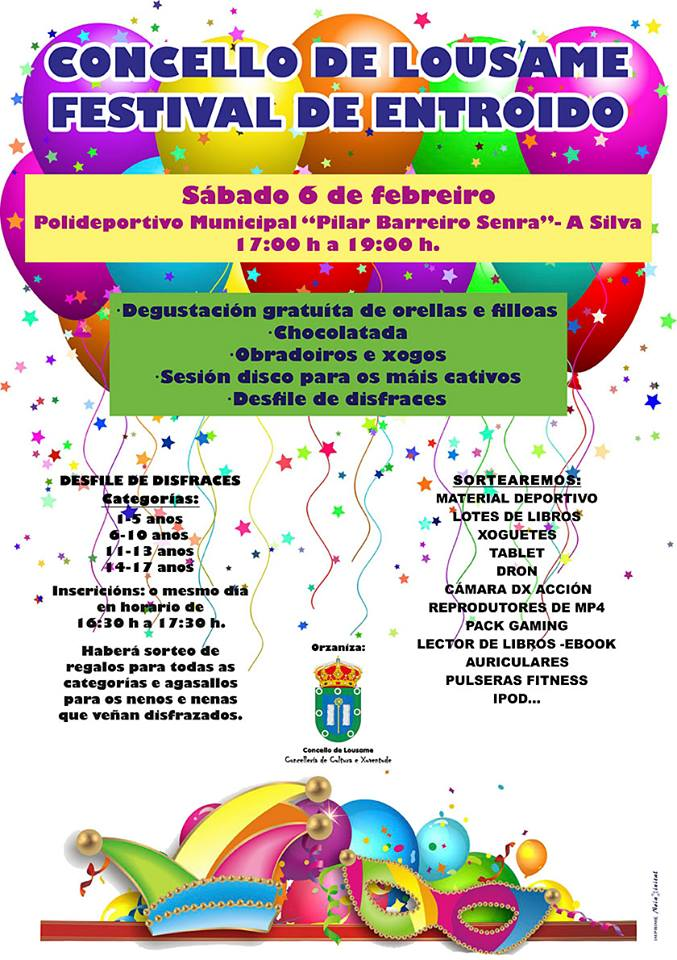 La cita con el Carnaval en Lousame es este sábado, 6 de Febrero en el Polideportivo Municipal “Pilar Barreiro Senra”- A Silva. Desde las 5 de la tarde un festival lleno de diversión y de premios. Desde A Ría da Estrela os adelantamos algunas cosas.