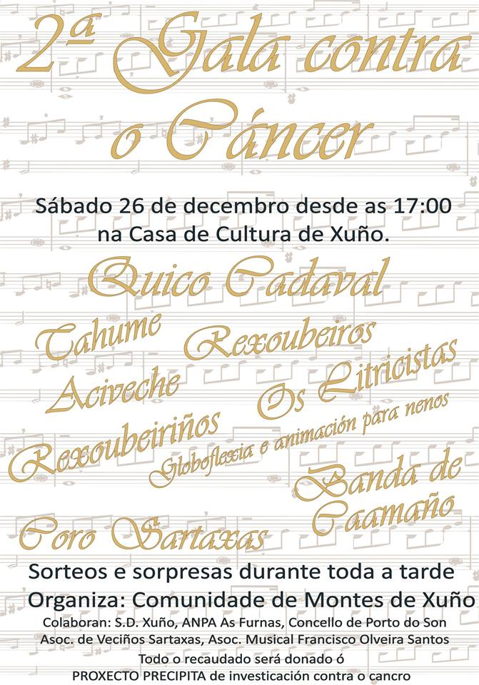 El sábado 26 de diciembre desde las 5 de la tarde en la Casa de Cultura de Xuño se celebrará la 2ª Gala Contra el Cáncer. Habrá globoflexia y animación para los niños, sorteos y sorpresas, actuaciones musicales, de danza…entretenimiento y diversión para una tarde solidaria en la que todo lo recaudado en las consumiciones y los sorteos, se donará a PROXECTO PRECIPITA, de investigación y lucha contra el cáncer.